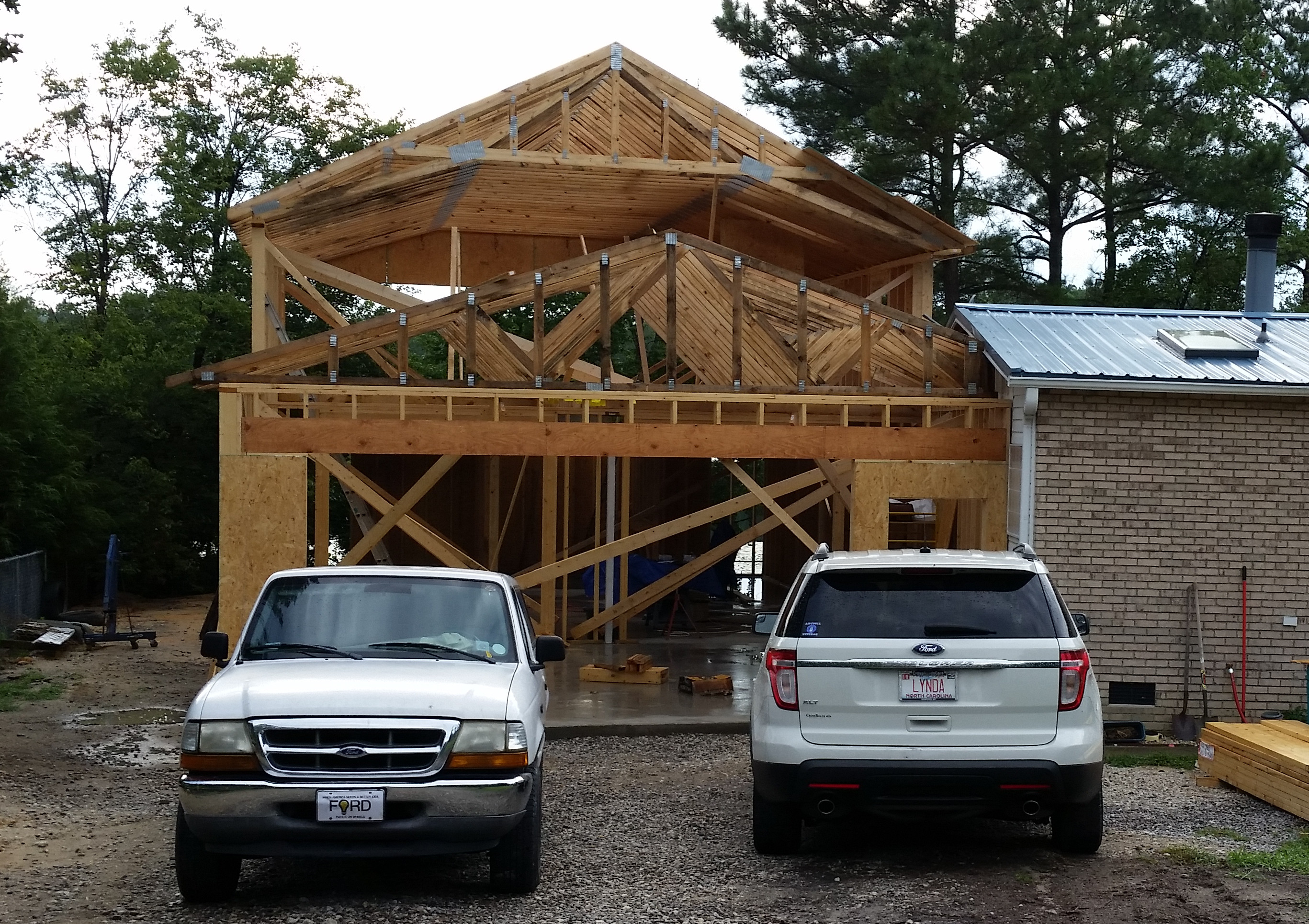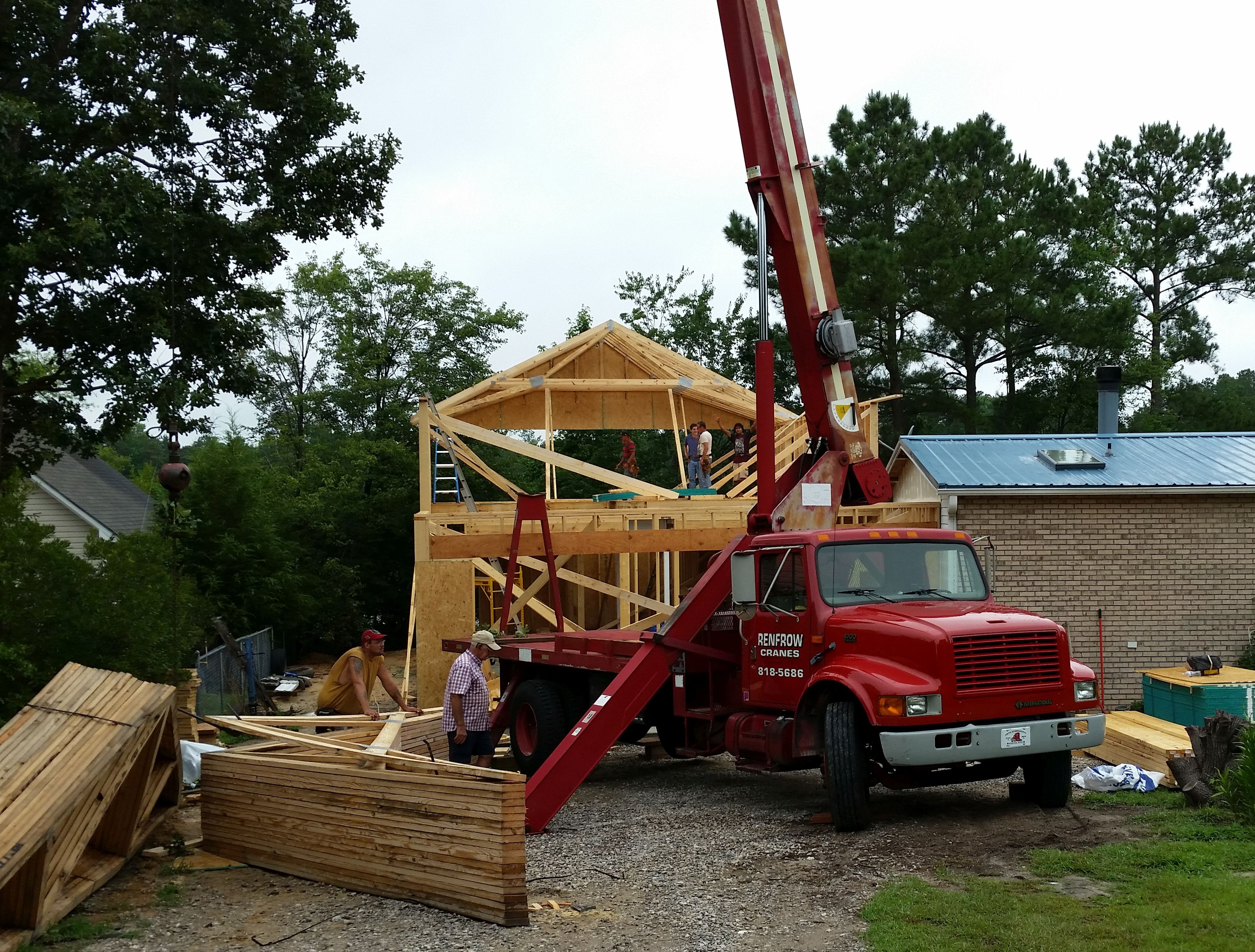 Framing started with the setting of the posts for the steel beam (which eliminated the need for any posts in the shop and the installation of the beam. It also incuded removing the siding from the south end of the house and building a firewall. We brought in a crane to lift the roof trusses into place. The framers did all of the exterior construction, the joint wall between garage and shop, the two walls that defined the stairwell, the 2nd floor, the floor of the loft over the lift area as well as the 2nd floor closet over the lower part of the stairs. They also helped me construct and set the post that anchored the inside of the U-shaped stairs. I did the remainder of the interior construction including the stairs into the house and the U-shaped stairs to the 2nd floor. I also installed all of the wall and ceiling insulation.