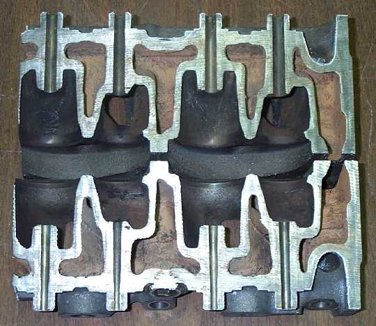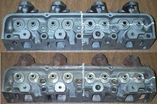 These heads, C4AE-G and C8AE-H, are not "virgin"; they've been used and abused. I will refer to them as the G or early head and the H or late head. The late head has the valves slightly sunk into the ports due, probably caused by running unleaden gasoline. See the page on Port Position for a description of the differences in the port design.